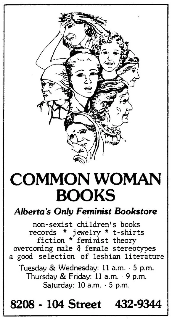 "The common woman is as common as the best of bread / and will rise / and will become strong." This verse from Judy Grahn’s Common Woman Poems decorated the walls of its namesake store, Common Woman Books. What began as one shelf in co-founder Halyna Freeland's basement in 1978 became a Garneau storefront in 1980, Alberta's first and only feminist bookstore at the time. Common Woman Books was also the first bookstore in Edmonton to use the word "Lesbian" to title its section of lesbian fiction and resources, a word that other booksellers largely shied away from. Over the thirteen years Common Woman Books was in operation in Garneau and Old Strathcona, it was well known as one of the city's few welcoming spaces for lesbian, bisexual, and otherwise queer or questioning women. The store helped build the foundation of Edmonton's longest running lesbian society, sharing information, resources, and space for over a decade. After Common Woman Books closed for the final time in early 1992, its legacy would continue to inspire successors for years to come.