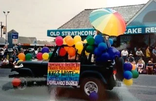 The political climate in Alberta Dumas referred to was the storm brewing between the Alberta government and Edmonton's 2SLGBTQ+ community. Delwin Vriend's tentative victory after his wrongful dismissal for his sexual orientation in 1991 was overturned by the Alberta Court of Appeal in 1996. The following year, a lesbian foster mother known as Ms. T. lost her battle to foster more children when the Alberta government banned placements with "non-normative" families. Orlando Books raised funds for both of these causes among many others, and frequently appeared in Pride marches down Whyte Avenue. Dumas' open and outspoken defense of herself and Edmonton's queer community was an act of bravery for all of those who could not take the risk.