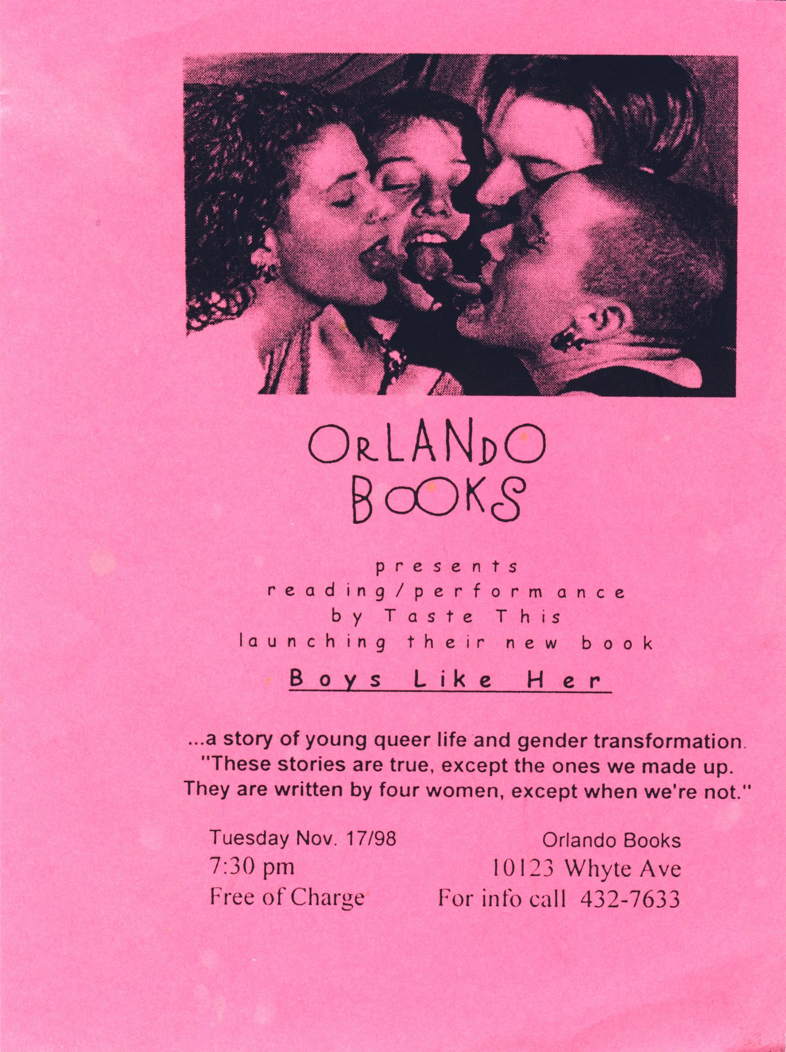 Other encounters with homophobia in her community would inspire Dumas to take action. When two students from the nearby Strathcona High School approached Dumas to ask if she would be interested in running an ad in the student paper alongside other Whyte Avenue businesses, she delivered. Along with the $25 fee, Dumas prepared an advertisement for Orlando Books with the line "Books for lesbian and gay youth and their friends," hoping to let students know where in town to find positive representations of the queer community. Within a few days, the editor of the school paper called to inform Dumas of a problem with the ad. "Was it the size? No, she said. The problem was the line about gay youth." When pressed to delete the line, of course, Dumas replied "Absolutely not."